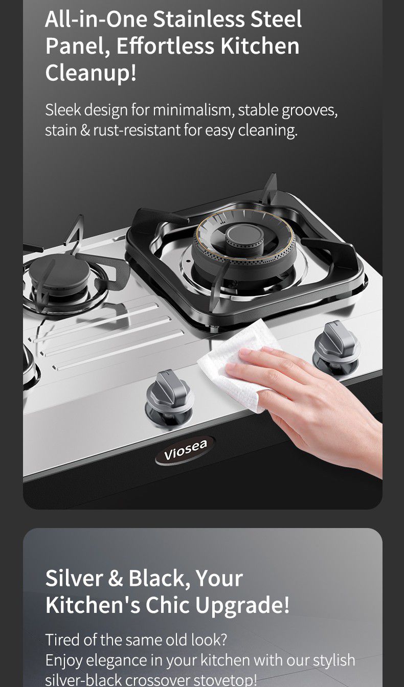 یہ ایک جدید طرز کا سٹینلیس سٹیل گیس چولہا ہے۔ چولہے میں تین برنرز ہیں، ہر ایک میں سیاہ برنر ہیڈ اور ایک ایڈجسٹمنٹ نوبل لگا ہوا ہے۔ چولہے کا کنارہ چاندی کا رنگ کا ہے، اور درمیان میں سیاہ کنٹرول پینل ہے جس میں چار گھڑوں اور ایک سوئچ بٹن ہیں۔ گیس چولہے کا ڈیزائن سادہ اور جدید ہے، جس میں ضرورت سے زیادہ سجاوٹی عناصر نہیں ہیں۔ پس منظر خالص سفید ہے، جس پر کوئی دوسرا شے یا متن نہیں ہے۔